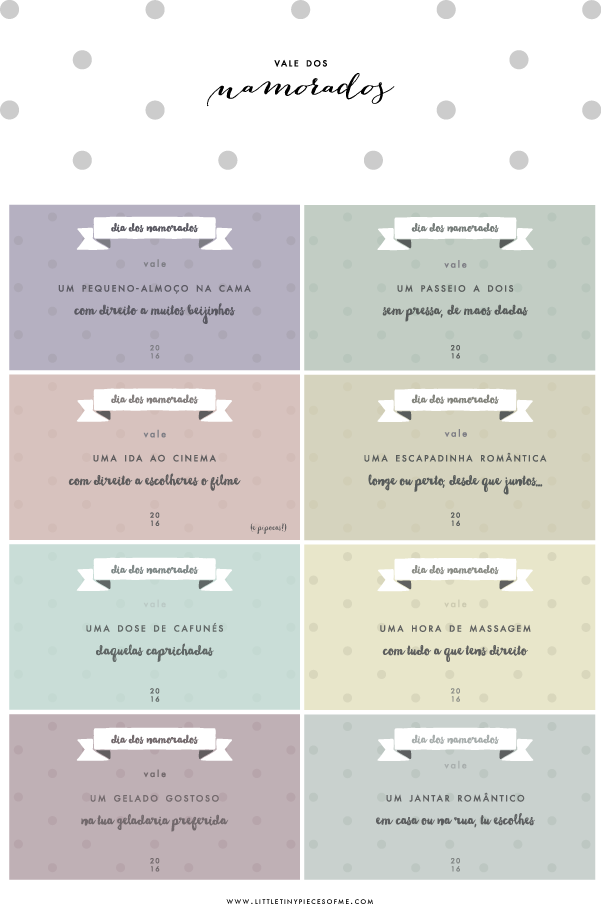 No fundo, servem estes vales para levar um sorriso sincero a quem vos faz rir todos os dias. E porque o Dia dos Namorados está aí à porta — e não precisam de gastar fortunas para fazer alguém feliz — deixo-vos aqui estes vales dos namorados para que possam imprimir (as vezes que quiserem). Esperemos que gostem e que lhes dêem muito uso. Eu farei questão de dar...