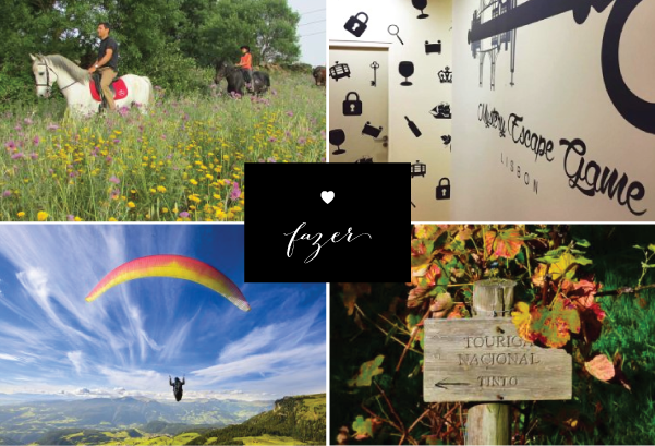 E se ainda sobrarem dúvidas do que poderão fazer no próximo, vejam-nos terminadas agora. Seleccionámos as quatro sugestões de programas que mais nos agradaram e queríamos partilhar convosco estas experiências. Um passeio romântico a cavalo ou a resolução de um enigma a dois são alternativas bem apaixonadas. Se forem do tipo aventureiro, podem sempre subir aos céus da Arrábida e deslumbrarem-se com a beleza desta terra — vista de cima. Por outro lado, podem sempre manter os pés bem assentes no chão com um passeio pelos trilhos de Colares, com direito a prova de vinho.