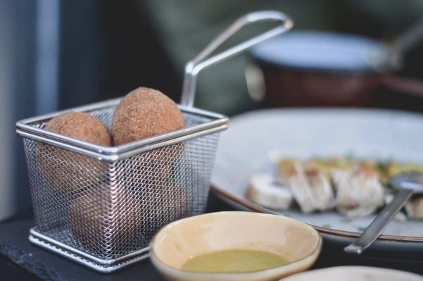 Pedimos alguns petiscos para partilhar e adorámos todos sem excepção. Pedimos primeiro o couvert e de seguida, a nossa opção recaiu nos tradicionais (e muito bem confeccionados) ovos mexidos com farinheira, croquetes com molho madame, umas cascas de batata (adoramos!) e frango com morcela e abacaxi.
