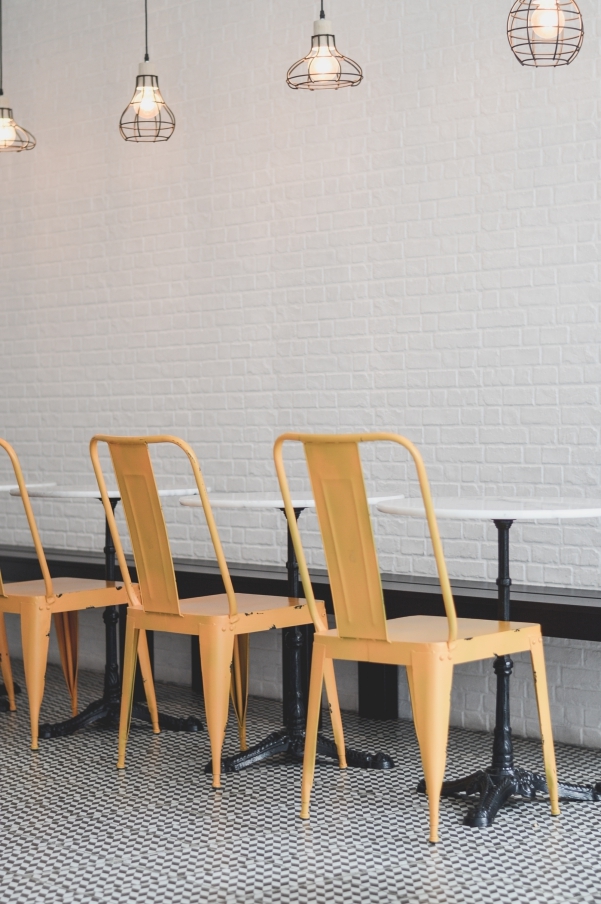 Um espaço (que não é muito grande mas é) acolhedor, com uma grande janela que emoldura a rua, um chão que é de sonho, as cores que não podiam ser mais perfeitas —preto, branco e amarelo — os candeeiros geométricos, as mesas de mármore e aqueles bagels, senhores!, aqueles bagels deliciosos.